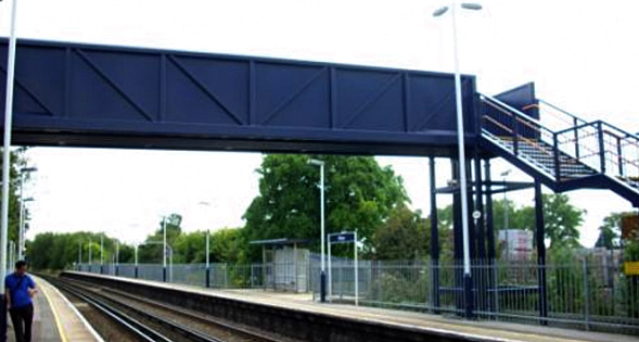 Showing a considerable development from the traditional railway footbridge, the accompanying photograph illustrates the steel footbridge erected over the railway line. The protective treatment selected for this structure was grit blasting and metal spraying with zinc to a thickness of 150 microns (0.003”) followed by a paint system for decorative surfaces.