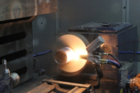 With Metallisation’s High Velocity Oxygen Fuel (HVOF) Spray Systems, liquid fuel and oxygen are fed into a combustion chamber. In the chamber they are ignited to produce a hot, high pressure gas stream, which is passed through a converging /diverging nozzle. Powder is then injected into the accelerated gas stream which heats and accelerates the powder particles so that they impact with tremendous kinetic energy upon the substrate material. The HVOF process does not melt the powders, it just softens them, resulting in minimal oxidation and decomposition of the coating material. The heat source used in the Met-JET 4L HVOF process is liquid kerosene and oxygen. Metallisation can also supply systems with gas fuel and oxygen.